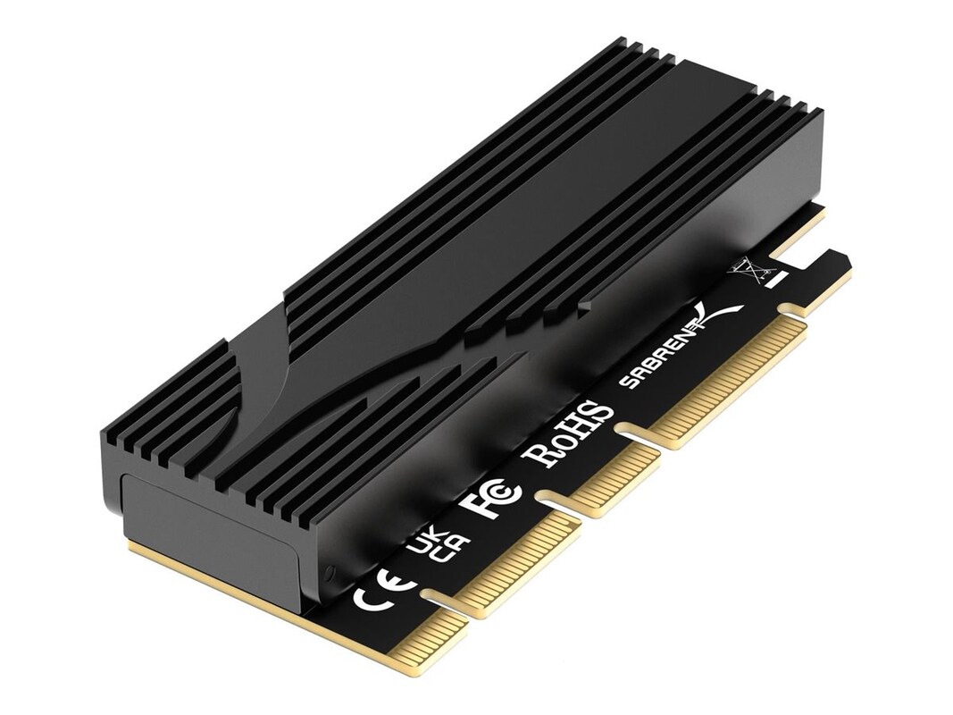 The Sabrent M.2 NVMe Solid State Drive to PCIe x16 Tool-Free Add-In Card with aluminum heatsink is designed to handle the newest solid state drives at Gen5 speeds and is able to keep them running cool - and quiet - with its built-in aluminum heatsink and thermal padding. The card is tool-free with an x16 physical connector for physical stability but may fit some x4/x8 PCIe slots. The card connects at x4 PCIe electrically for maximum drive performance and will work in previous PCIe generation slots at their respective speeds, as well as in future PCIe generation slots at up to 5.0 speeds.