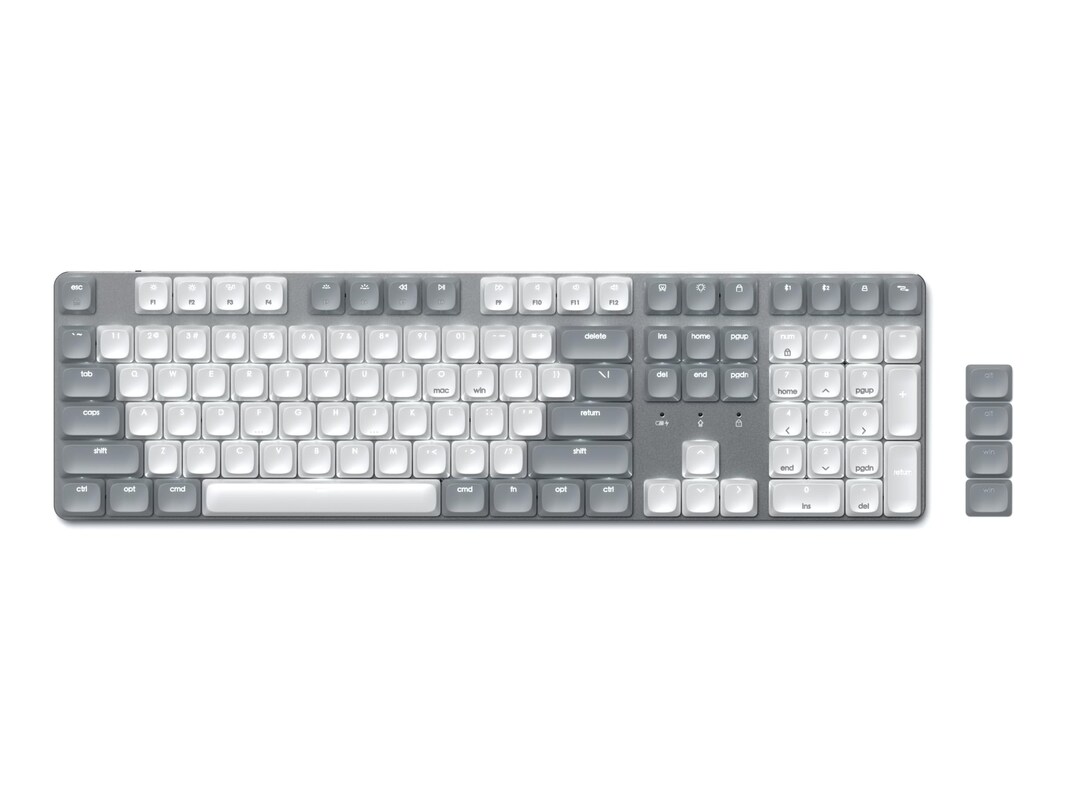 Introducing our first full-size mechanical keyboard designed to seamlessly function with both Mac and Windows systems. Available in Light and Dark color variants, this rechargeable keyboard features a 108-key layout with a numeric keypad, low-profile brown switches, four-device connectivity, 14 different backlight patterns, and dedicated Windows and macOS input keys. Its slim, ergonomic design boasts a sleek aluminum enclosure, removable keycaps, and adjustable feet for optimum efficiency and comfort.